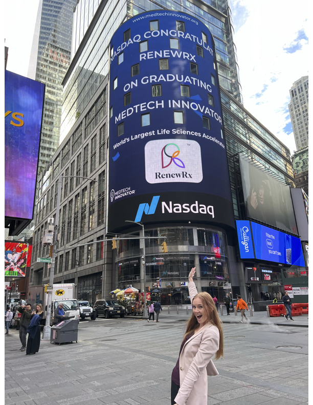 New York, NY [October 15, 2025] – Earlier today, RenewRx was featured on the iconic Nasdaq Tower in Times Square as part of a special celebratory campaign by Medtech Innovator (MTI). The display spotlighted all 64 companies completing the MTI Accelerator program, showcasing their names and logos on the tower’s massive digital screens.